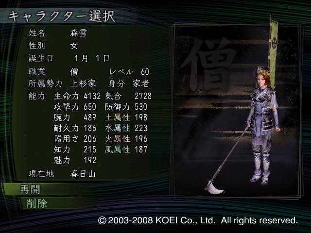 刀鍛 58 中老 上杉所属 仙道 55 奉行 上杉所属 忍術 58 中老 浅井所属 軍学 56 奉行 上杉所属 殺陣 58 中老 上杉所属 暗殺 59 中老 上杉所属 |